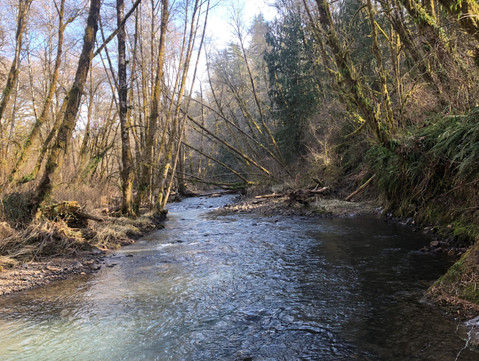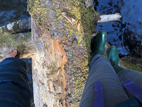 Here we are on a brisk yet sunny winter afternoon, walking the trail with our pup. Under the trees crisscrossing above our heads, fallen logs ravaged by age and decaying with moisture, and alongside slanted rock walls with moss and ferns growing out of biotically weathered cracks. Along the way limbs from downed trees reveal complicated galleries carved into the wood by beetles and other insects. Fir, Hemlock and Cedar cones mingled with the soil and needles dropped down from the canopy above. Discarded bark shows row after row of Sapsucker wells-the pattern unmistakable. We reach the river and find the rocks along the shore frozen over with ice from a long-term misting of water. Globules of the thick frozen liquid adhered to the moss, thickets, and tangles of dried grass. Our off-leash companion explores all over, nimbly running over the rocks and sniffing everything in sight.